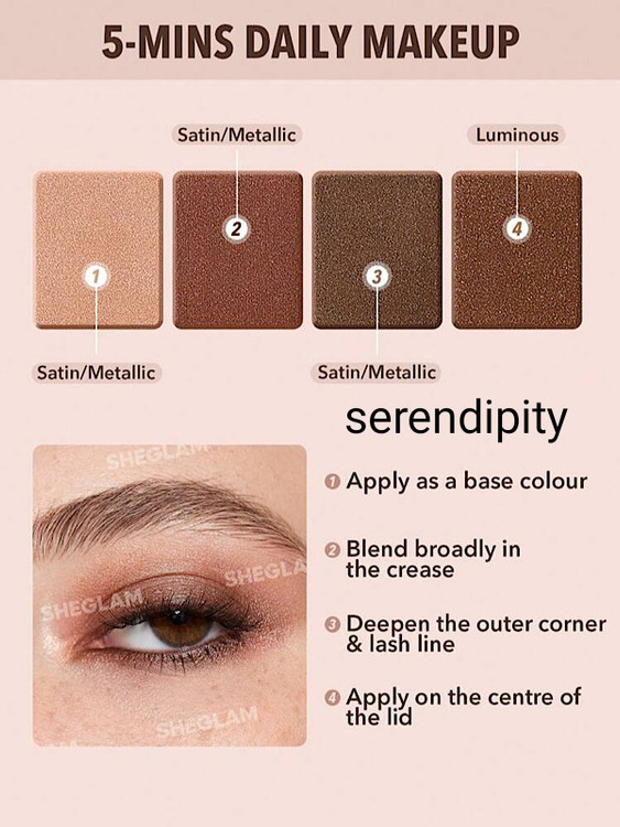 سایه چشم Serendipity شیگلم با چهار رنگ متنوع، امکان خلق آرایشهای گوناگون را به شما میدهد. رنگهای موجود در این پلت مناسب برای بیس سایه، خط بالای پلک، روی پلک و همچنین برای گوشههای داخلی و خارجی چشم هستند.