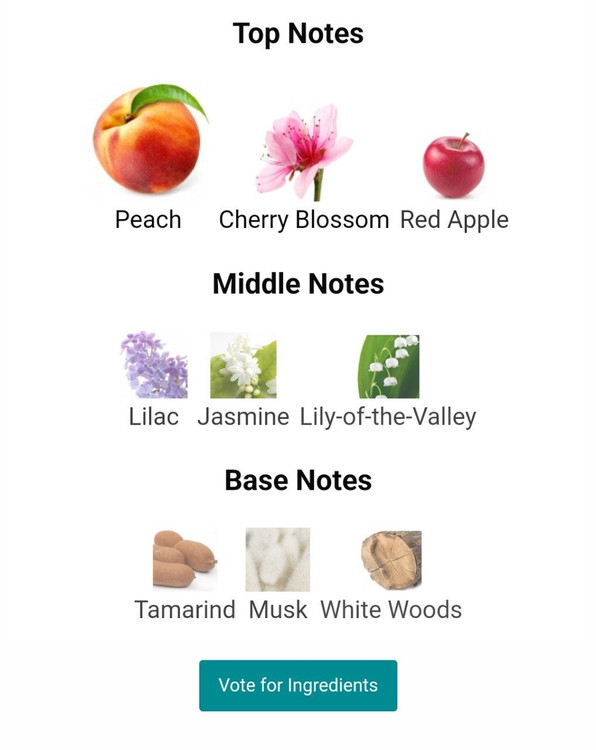 گلی و میوه ای گرم و ملایم، رایحه شکوفه هلو و گیلاس و گل بنفشه و یاس،نت نهایی چوب