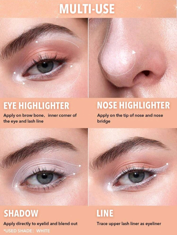 ✨از این محصول هم به عنوان هایلایتر برای روی بینی یا گوشه چشم و گونه و هم به عنوان سایه می توان استفاده نمود .