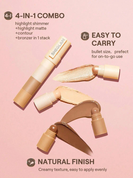 قلم چندکاره آرایشی SHEGLAM Multi-Glam یک ابزار زیبایی کامل ۴ در ۱ است که شامل هایلایتر براق، هایلایتر مات، کانتور و برنزر است؛ همه در یک طراحی باریک و شبیه به قلم. بافت نرم آن بهآسانی روی پوست میلغزد و ترکیب آن برای ایجاد ظاهری طبیعی و خوشفرم ساده است.