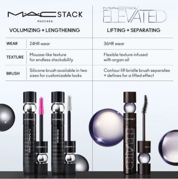 نکات دیگری که باید بدانید: ریمل MACStack Elevated دارای یک برس منحنی دو طرفه با نوک دقیق است که مژه ها بدون جمع شدن به وضوح بلند می شود و حجم می گیرند. این فرمول قابل ساخت( امکان افزودن لایه لایه)، 91 درصد مشتق شده از طبیعت* که دارای روغن آرگان است. همچنین ضد عرق و رطوبت، ضد لک و ریزش و ضد پوسته پوسته شدن است.